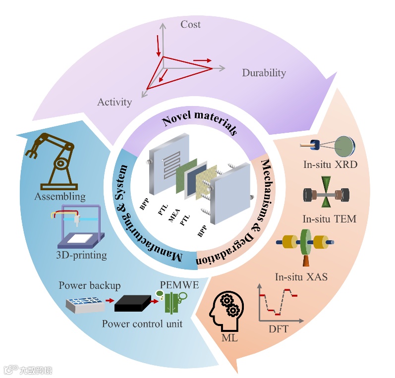 2. 反应机理及组件退化的研究。对活性位点反应机理和结构演变的研究有助于推动催化剂的设计和合成。PEMWE系统的运行成本与电解槽的稳定性息息相关。加速压力测试和机器学习方法可以用以评估系统的运行和堆组件的腐蚀状况。