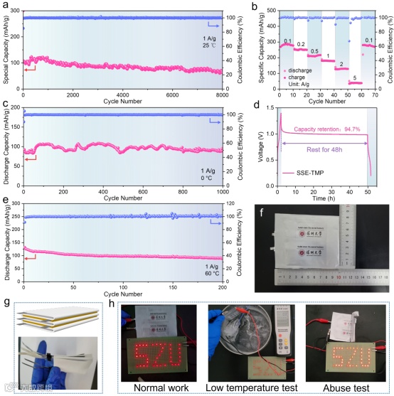 图3. 基于SSE-TMP的VO2(B)|Zn全电池在a) 25 ℃、 c) 0 °C 和 e) 60 °C下的循环性能。b) 基于SSE-TMP的VO2(B)|Zn全电池在25℃下的倍率性能。d) 基于SSE-TMP的VO2(B)|Zn全电池25℃下的自放电性能测试。f) 基于SSE-TMP的VO2(B)|Zn软包电池图像。g) 五层叠片示意图。h) 正常和极端条件下的软包电池图像。