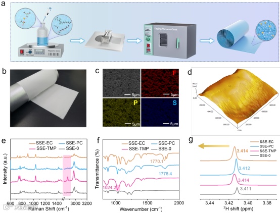 图2. a) SSE-TMP的合成示意图。b) SSE-TMP 的光学图片。c) SSE-TMP 的 SEM 图像和 EDS 图像。d) SSE-TMP 的 AFM 表面粗糙度。SSE-TMP、SSE-PC、SSE-EC 和 SSE-0 的 e) Raman光谱、 f) FTIR 光谱和2H NMR 光谱。