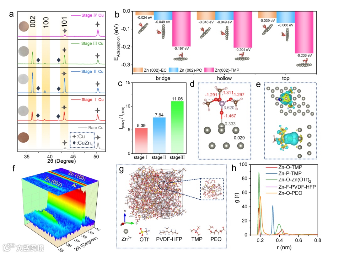 图 4. a) 基于 SSE-TMP 循环不同阶段铜箔的非原位XRD 比较。b) 三种溶剂分子与Zn(002)晶面的吸附能比较。c) 基于不同阶段铜箔表面的Zn(002)晶面和Zn(100)晶面的峰值比。d) TMP和Zn的化学吸附模型图。e) TMP和Zn的差分电荷图。f) 沉积/剥离过程中 Zn|SSE-TMP|Al 非对称电池的原位 XRD 等值线图。g) SSE-TMP的MD模拟分子快照。h) SSE-TMP 的 RDF 分析。