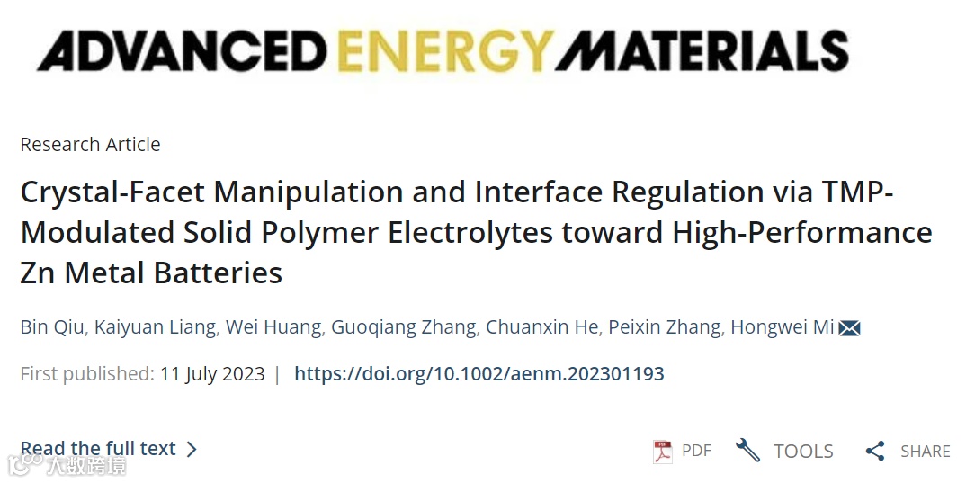 近日,深圳大学米宏伟特聘研究员团队在固态锌离子电池领域取得研究进展,在国际知名期刊Advanced Energy Materials上发表了题为“Crystal-Facet Manipulation and Interface Regulation via TMP-Modulated Solid Polymer Electrolytes toward High-Performance Zn Metal Batteries”的研究文章。该工作通过添加一种绿色阻燃添加剂——磷酸三甲酯(TMP),调控聚合物固态电解质中Zn2+溶剂鞘结构,从而诱导Zn2+沿Zn(002)晶面定向均匀沉积。这一有高效简单的策略有助于调整聚合物固态电解质的溶剂鞘结构和优化电解质-电极界面本征动力学行为,对聚合物基固态电解质的商业化应用具有参考作用。