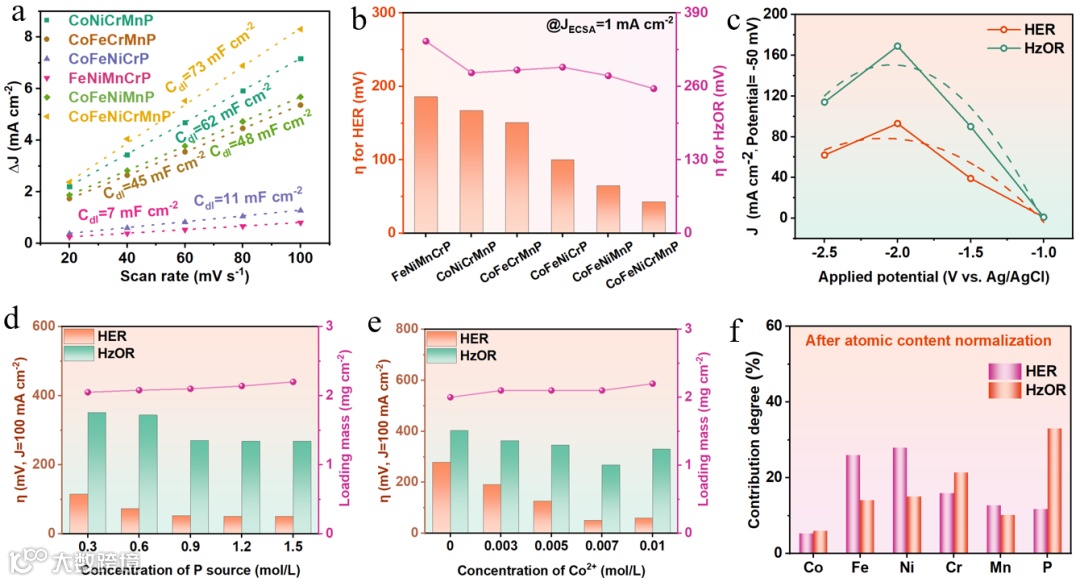 图4:不同高熵材料的(a) Cdl拟合值和(b)ECSA归一化性能比较图。(c) 不同电沉积电压合成的CoFeNiCrMnP/NF样品对HER和HzOR催化活性。不同浓度Co和P源制备的CoFeNiCrMnP/NF的双功能活性比较图。(e) 各单一金属提高双功能催化活性的贡献度。