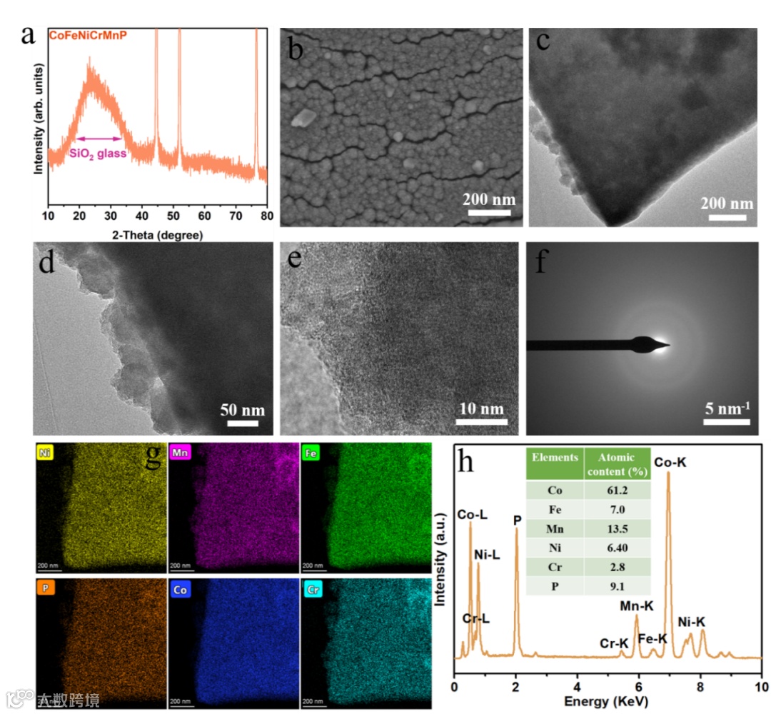 图2:CoFeNiCrMnP材料的 (a)XRD和 (b)SEM,(c、d)TEM,(e)HRTEM,(f)SAED和(g)元素分布图,(h) CoFeNiCrMnP材料的EDS图和ICP-OES测试的各元素含量。