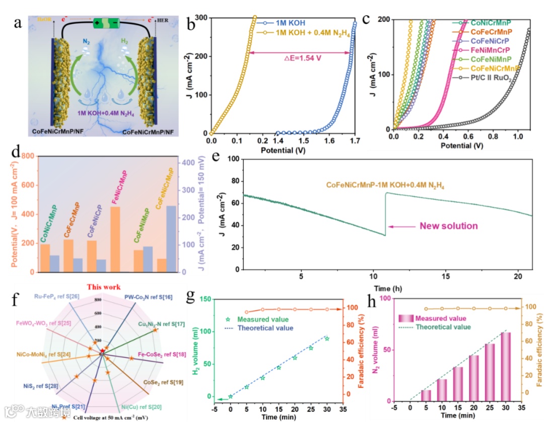 图3:(a) N2H4辅助全解水示意图。(b) CoFeNiCrMnP/NF两电极电解槽的LSV曲线。(c)不同高熵材料的LSV曲线和(d)性能对比图。(e) CoFeNiCrMnP/NF两电极电解槽的稳定性测试。(f) CoFeNiCrMnP/NF与其他已报道的催化剂的催化活性比较图。(g)HER和(h)HzOR的法拉第效率。