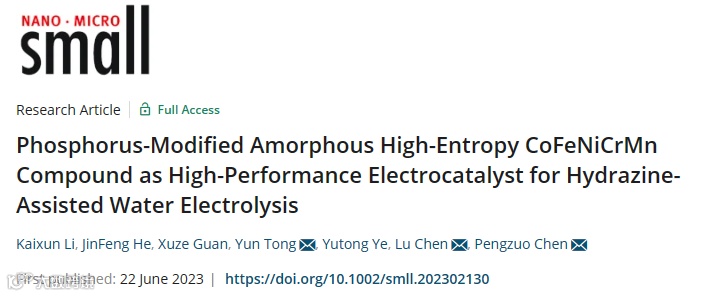 近日,来自浙江理工大学化学与化工学院的陈鹏作研究员、童赟副教授和伦敦大学学院的陈露博士合作,在国际知名期刊Small上发表题为“Phosphorus-Modified Amorphous High-Entropy CoFeNiCrMn Compound as High-Performance Electrocatalyst for Hydrazine-Assisted Water Electrolysis”的文章。该工作采用一步电沉积法,在泡沫镍(NF)表面制备了一种P修饰的无定形CoFeNiCrMn高熵化合物,并展现了优异的HER和HzOR双功能催化活性(图1)。