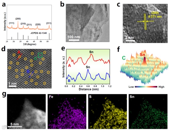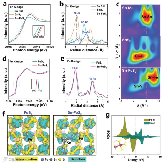近日,兰州交通大学褚克教授课题组在Advanced Functional Materials上发表了题为“Atomically Dispersed Sn Confined in FeS2 for Nitrate-to-Ammonia Electroreduction”的研究文章。文章证明了在FeS2上分散单原子Sn,构建p-d杂化的Sn-Fe双活性位点,可以作为一种高效的NO3RR催化剂。电化学测试表明,在-0.5 V. RHE的电位下,Sn-FeS2达到96.7%的法拉第效率和15.8 mg h-1 cm-2的NH3产率,这一性能超过了近期绝大多数已报道的NO3RR催化剂。理论计算结合原位表征表明,p-d杂化的Sn-Fe双活性位点能够协同促进NO3-的活化,优化反应中间体的吸附能促进加氢反应,并同时抑制HER。