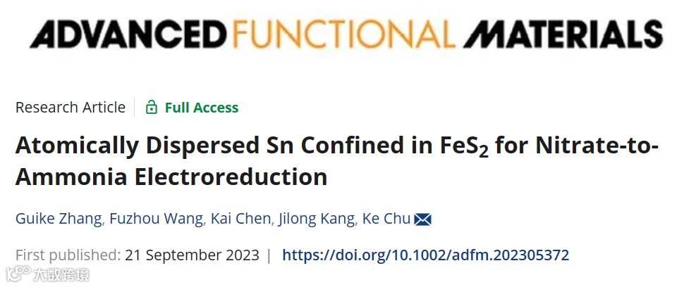 Guike Zhang, Fuzhou Wang, Kai Chen, Jilong Kang, and Ke Chu*,Atomically Dispersed Sn Confined in FeS2 for Nitrate-to-Ammonia Electroreduction,Adv. Funct. Mater., 2023, 2305372.