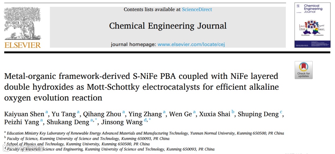近日,云南师范大学邓书康教授、杨培志研究员与昆明理工大学王劲松副教授在国际知名期刊Chemical Engineering Journal上发表题为“Metal-Organic Framework-Derived S-NiFe PBA Coupled with NiFe Layered Double Hydroxides as Mott-Schottky Electrocatalysts for Efficient Alkaline Oxygen Evolution Reaction”的研究文章。