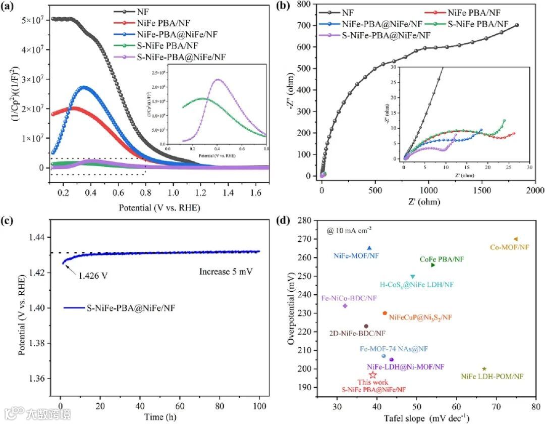 图5. (a) Mott-Schottky图(插图为放大Mott-Schottky曲线);(b)不同催化剂电极的Nyquist图(插图为放大EIS曲线);(c) S-NiFe PBA@NiFe/NF在10 mA cm-2恒定电流密度下的稳定性;(d) 10 mA cm-2恒定电流密度下的OER活性对比图。