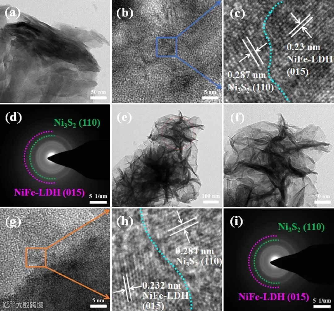 图3. S-NiFe PBA@NiFe/NF(反应前):(a) TEM图,(b-c) HRTEM图,(d) SAED图;S-NiFe PBA@NiFe/NF(反应后):(e-f) TEM图,(g-h) HRTEM图,(i) SAED图。
