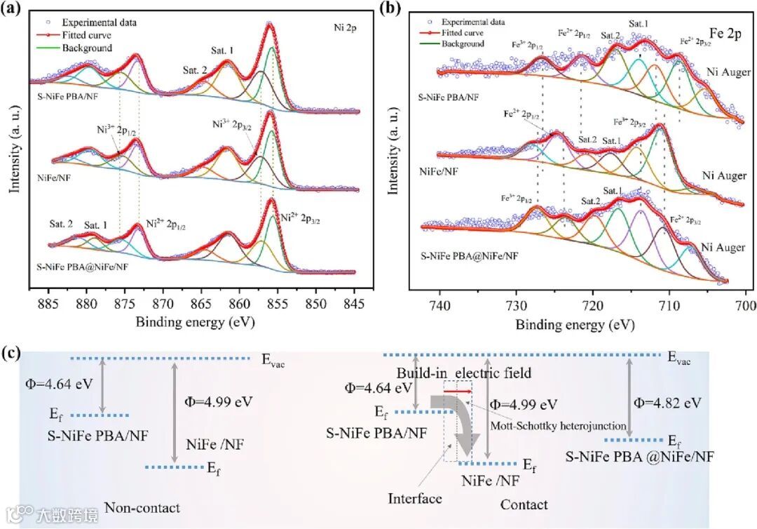 图4. S-NiFe PBA/NF,NiFe/NF和S-NiFe PBA@NiFe/NF的高分辨XPS能谱:(a) Ni 2p,(b) Fe 2p;(c) S-NiFe PBA@NiFe/NF Mott-Schottky异质结能带图。
