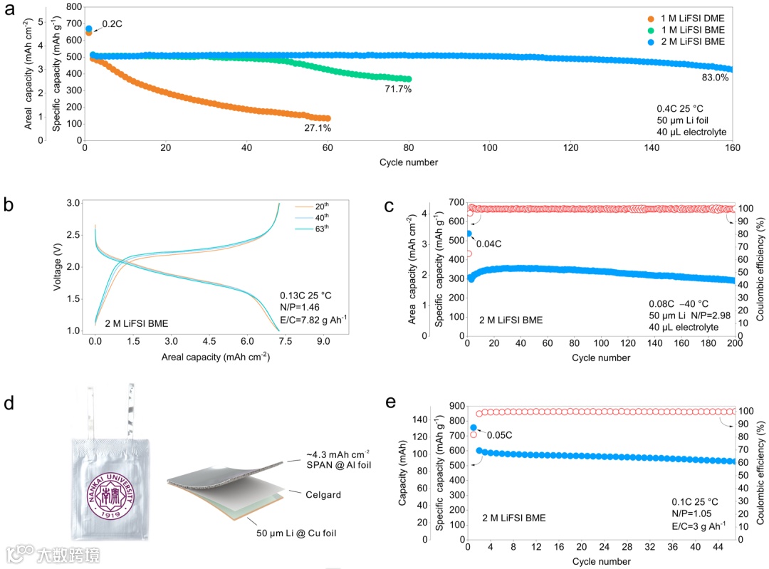 得益于2 M LiFSI BME电解液同时兼顾SPAN正极和锂负极,Li||SPAN全电池在高负载以及超高负载(面负载~7.3 mAh cm-2)下均具有出色的循环稳定性。并且,该电解液还可以实现高负载Li||SPAN全电池在−40℃极端温度下稳定运行。此外,Li||SPAN软包电池的良好表现证实了2 M LiFSI BME电解液具有实际应用的潜力。