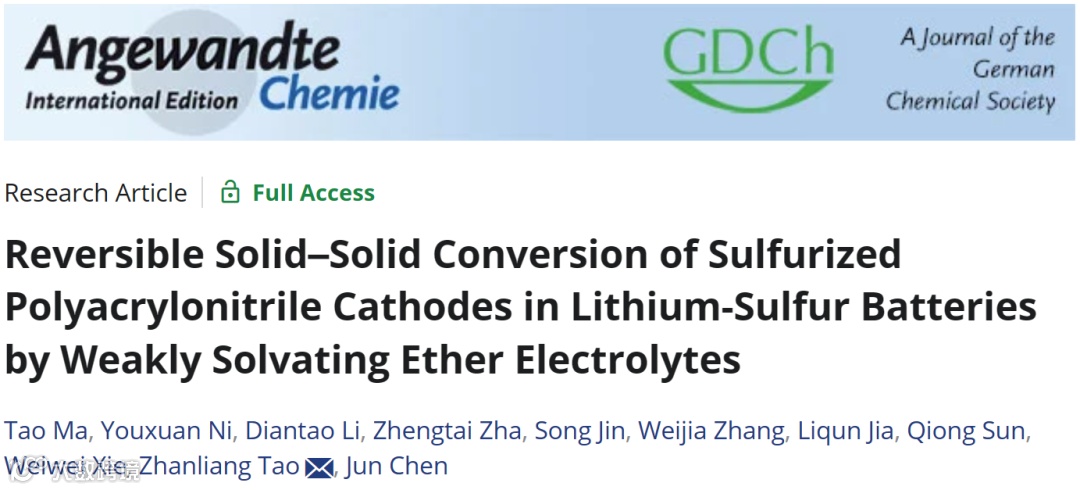 近日,南开大学化学学院陶占良教授团队提出了一种可同时兼顾SPAN正极和锂金属负极的低浓度醚类电解液(2 M LiFSI BME)。该电解液可以在SPAN表面分解产生坚固的阴极-电解质界面(CEI), 其可有效阻挡多硫化物溶解到电解液中,使得 SPAN 进行可逆的"固-固"转化。同时,该工作也揭示了醚类电解液与SPAN不兼容的根本原因。该工作以题为“Reversible Solid–Solid Conversion of Sulfurized Polyacrylonitrile Cathodes in Lithium-Sulfur Batteries by Weakly Solvating Ether Electrolytes”在国际顶级期刊Angew. Chem. Int. Ed.上发表。