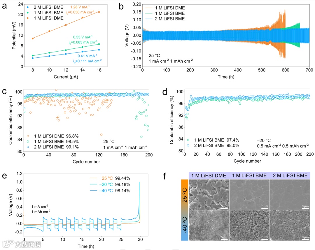 富阴离子溶剂化结构除了可以衍生更稳定的界面膜,还赋予了锂离子快速的电镀动力学。因此,2 M LiFSI BME电解液表现出极佳的锂电镀/剥离稳定性。即使在−40℃下,依旧表现出98.14%的库仑效率,这极大的拓宽了电解液的可工作温度区间。