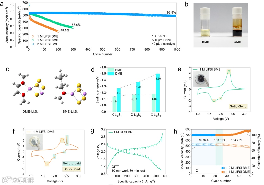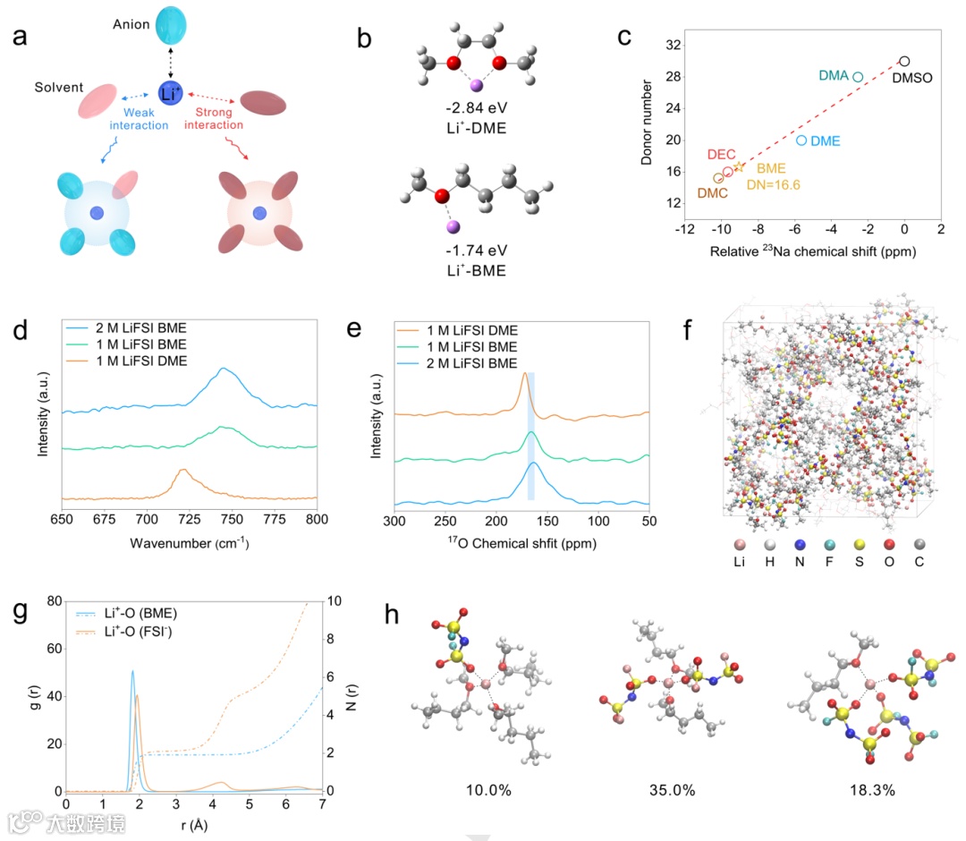 电解液的溶剂化结构取决于溶剂和阴离子对锂离子的竞争能力。当电解液使用低溶剂化能的溶剂时,溶剂化结构由阴离子主导。反之,溶剂分子占据锂离子的溶剂壳层。与常用的1,2-二甲氧基乙烷 (DME) 相比,甲基正丁基醚 (BME) 只有一个醚氧。理论上,BME具有更低的溶剂化能力。DFT计算以及DN值测试证实了这一点。拉曼和核磁光谱表明,相比于1 M LiFSI DME电解液, 1 M LiFSI BME电解液的溶剂化结构中存在更多的阴离子。当BME电解液浓度提升到2 M时,电解液溶剂化结构中阴离子的数目进一步增加。MD模拟也印证了该实验结果。