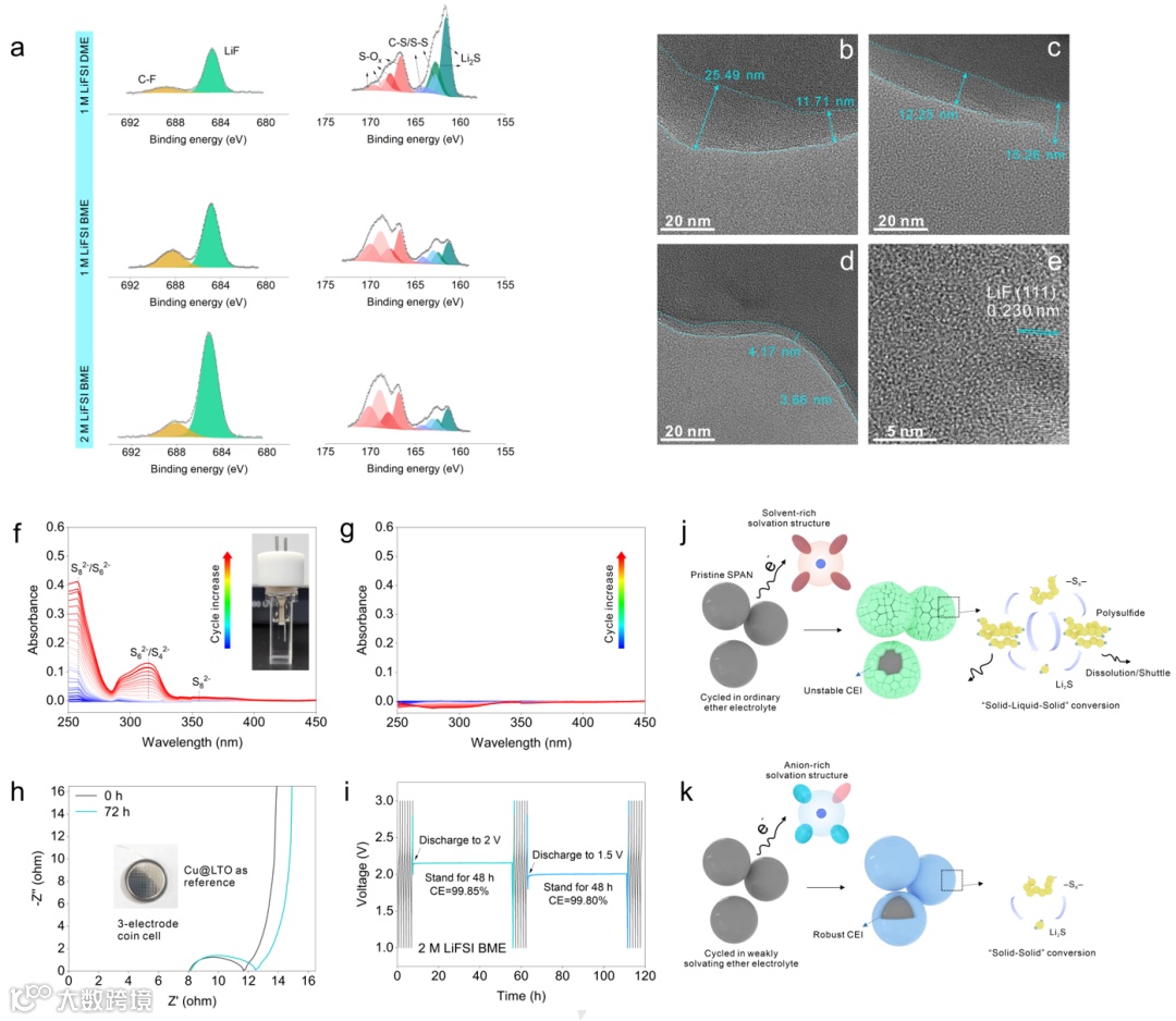 实验表明,三种电解液会在SPAN锂化过程中发生还原分解。而具有不同溶剂化结构的电解液在SPAN上衍生出了截然不同的CEI膜。总体来说,随着溶剂化结构中阴离子数量的提升,SPAN表面形成了更薄且更多阴离子分解产物的CEI膜。原位紫外、自放电、EIS测试证实了2 M LiFSI BME 衍生的CEI具有最强的稳定性,可以很好的抑制SPAN循环过程中多硫化物的溶解/穿梭。