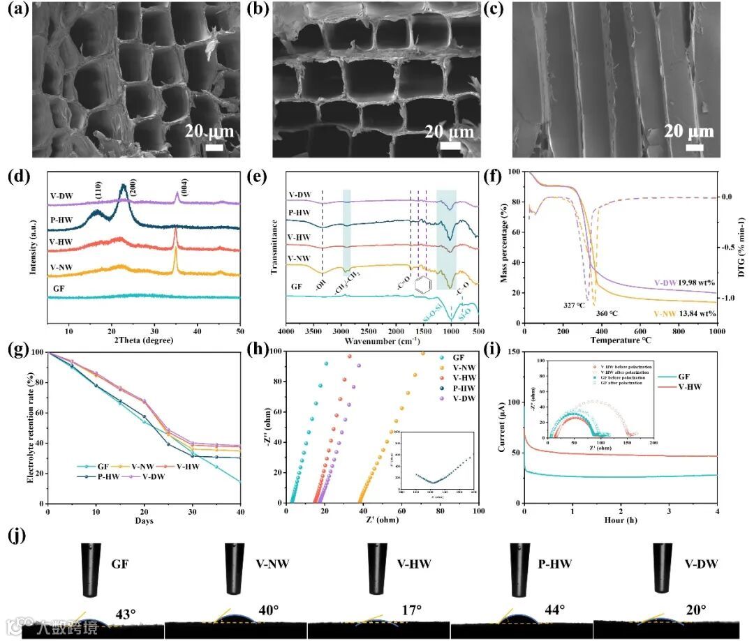 图2 (a) V-NW的SEM图像;(b) V-HW的顶面和(c)横截面SEM图像;(d) 木质隔膜的XRD和 (e) 拉曼图谱;(f) 木质隔膜的TG和DTG曲线;(g) 不同隔膜对液体电解质的保持率 (h) 离子电导率 和 (i) 锂离子转移数测试;(j)电解液在隔膜上的接触角。