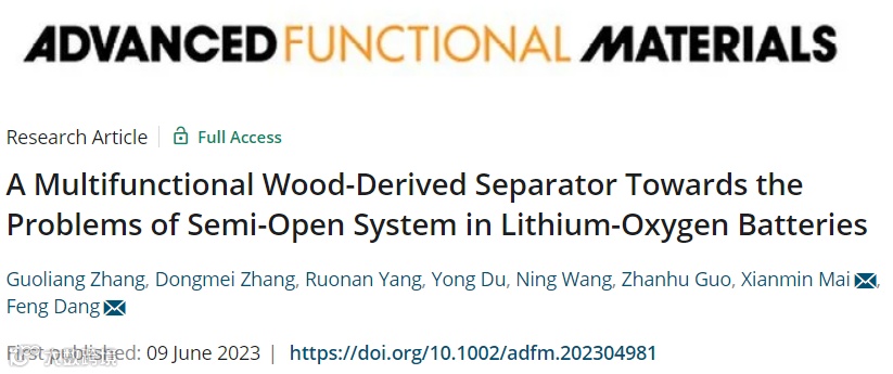 A Multifunctional Wood-Derived Separator Towards the Problems of Semi-Open System in Lithium-Oxygen Batteries. Guoliang Zhang, Dongmei Zhang, Ruonan Yang, Yong Du, Ning Wang, Zhanhu Guo, Xianmin Mai*, Feng Dang*
