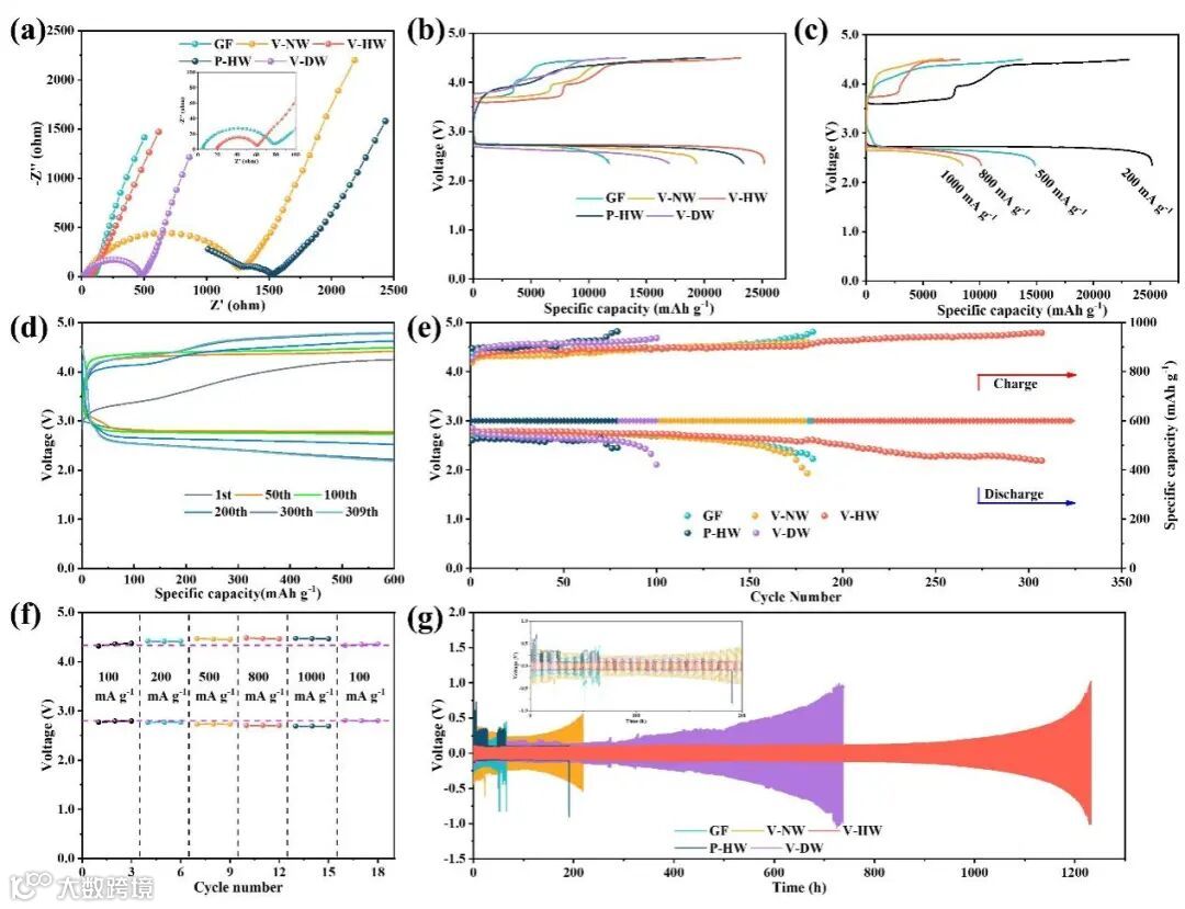 图3(a)组装有不同类型隔膜的阻抗图谱; (b) 各电池的首圈容量测试;(c) 不通电流密度下V-HW隔膜电池的倍率性能; (d-e) V-HW电池的循环性能;(f)不同电流密度下V-HW电池的电压稳定性。(g) 不同类型隔膜在锂对称电池中的工作稳定性。