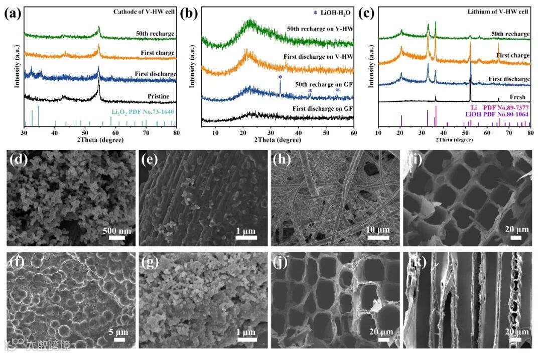 图4 (a) V-HW电池中的阴极, (b)GF或V-HW电池中的隔膜, (c)V-HW电池中锂阳极在循环过程中不同阶段的XRD图谱; (d) 初始阴极SEM图像; (e) GF电池中阴极放电后的SEM图像; (f)V-HW电池中完全放电和 (g) 50th 充电后的阴极SEM图; (h)完全放电后的GF的SEM图 (i)完全放电和第50次充电后电池中的V-HW的SEM (j)顶面和 (k)横截面图。