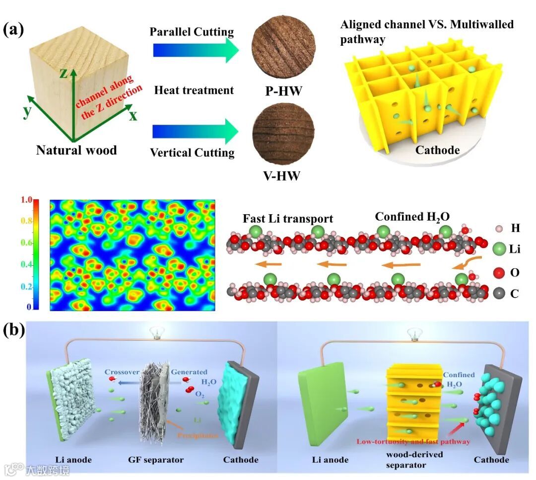 图1(a)在不同的切割方向的木质隔膜以及内部排列通道,其中锂离子可沿着木材中的定向纤维素迁移。电子分布图显示了纤维素中均匀的电子分布。b)LOBs中木质隔膜和GF隔膜的工作原理示意图。