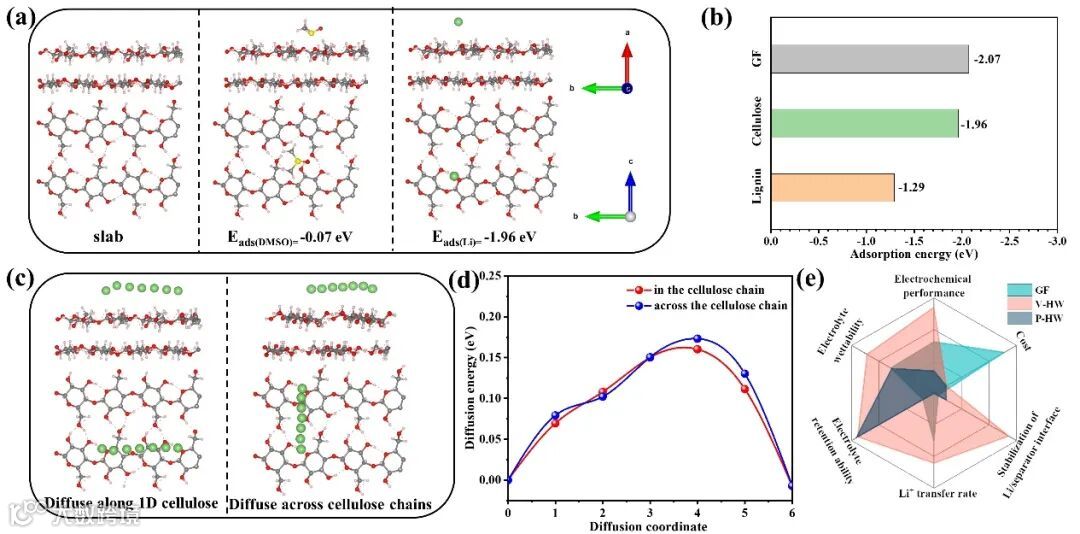 图5 (a) 溶剂分子和锂离子吸附在纤维素上的稳定结构; (b) 锂离子在不同基体上的吸附能;(c) 锂离子在纤维素上的迁移路径及其对应的 (d) 迁移势垒; (e) 各隔膜性质比较。