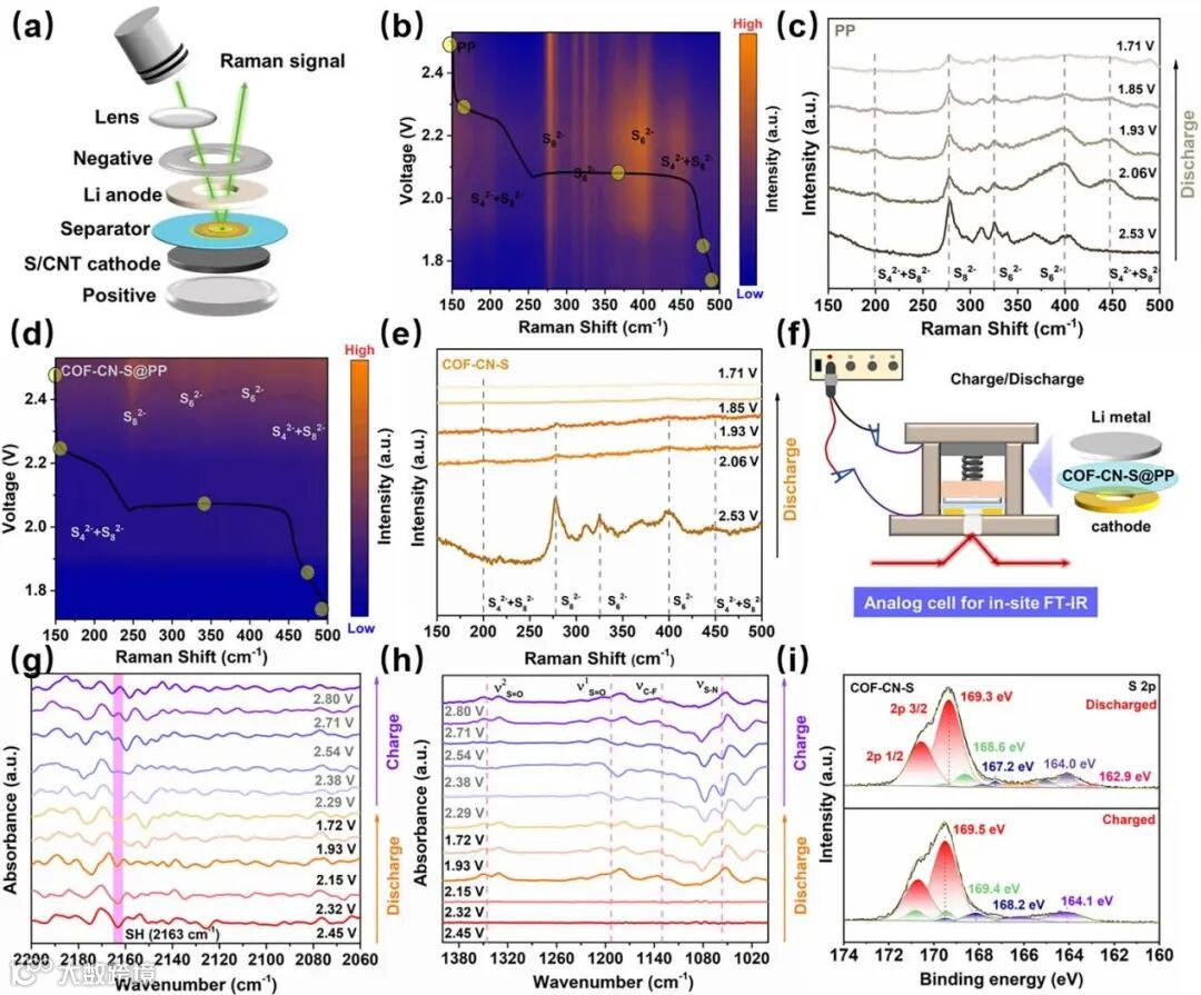 Figure 7. a) Schematic illustration of in situ Raman detection. Raman spectra at 0.10 C of the discharge process and Raman signals of the batteries at different voltage states with b,c) PP and d,e) COF-CN-S@PP separators, respectively. f) Schematic of in-situ FT-IR spectro-electrochemical cell. g,h) FT-IR spectral of COF-CN-S-modified battery at the current of 0.1C. i) XPS spectra of S 2p at a discharged state (upper) and charge state (below), respectively.