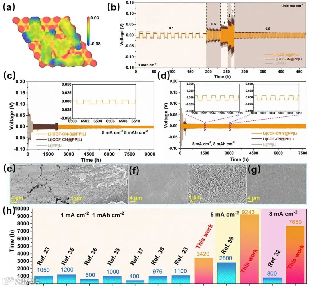 Figure 4. a) Distribution of electrostatic potential on the interface of Li (111) surface and COF-CN-S. b) Rate performance. Voltage-time profiles of Li plating/stripping processes in Li| |Li cells with PP, COF-CN@PP, and COF-CN-S@PP separators at 5 mA cm−2 for 5 mA h cm−2 c), at 8 mA cm−2 for 8 mA h cm−2 d). SEM images of cycled Li-PP e), Li-COF-CN f), and Li-COF-CN-S g) at 5 mA cm−2 with an areal capacity of 5 mAh cm−2 after 500 cycles. h) Comparison of cycling stability of the Li|COF|Li cell in this work with those of other recently reported results in symmetrical Li||separator||Li cells.