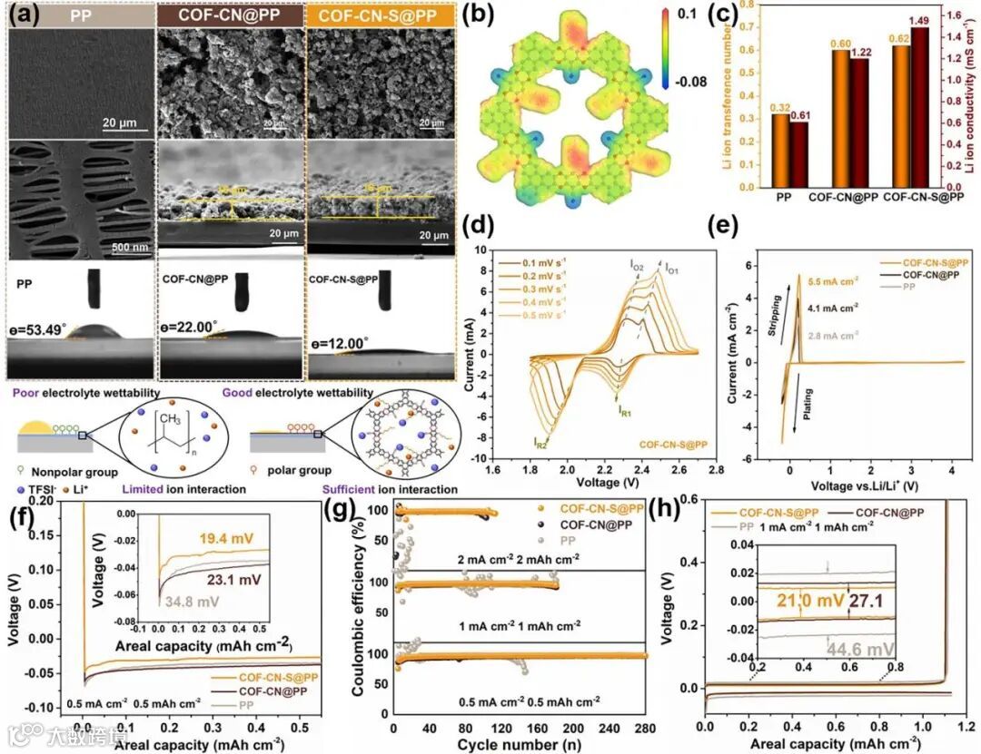 Figure 3. a) SEM image, cross-section SEM image, and contact angle test of separators. b) Electrostatic potential distributions of COF-CN-S. c) Li-ion conductivity and Li-ion transference number of PP, COF-CN@PP, and COF-CN-S@PP separators. d) CV profiles at different scan rates with COF-CN-S. e) CV curves of PP, COF-CN@PP, and COF-CN-S@PP separator. f) The nucleation overpotentials of COF-CN-S@PP, COF-CN@PP, and PP separator. g) CE of Li-Cu cells. h) Voltage profiles at 1.0 mA cm−2 for 1.0 mA h cm−2 for Li-Cu cell.