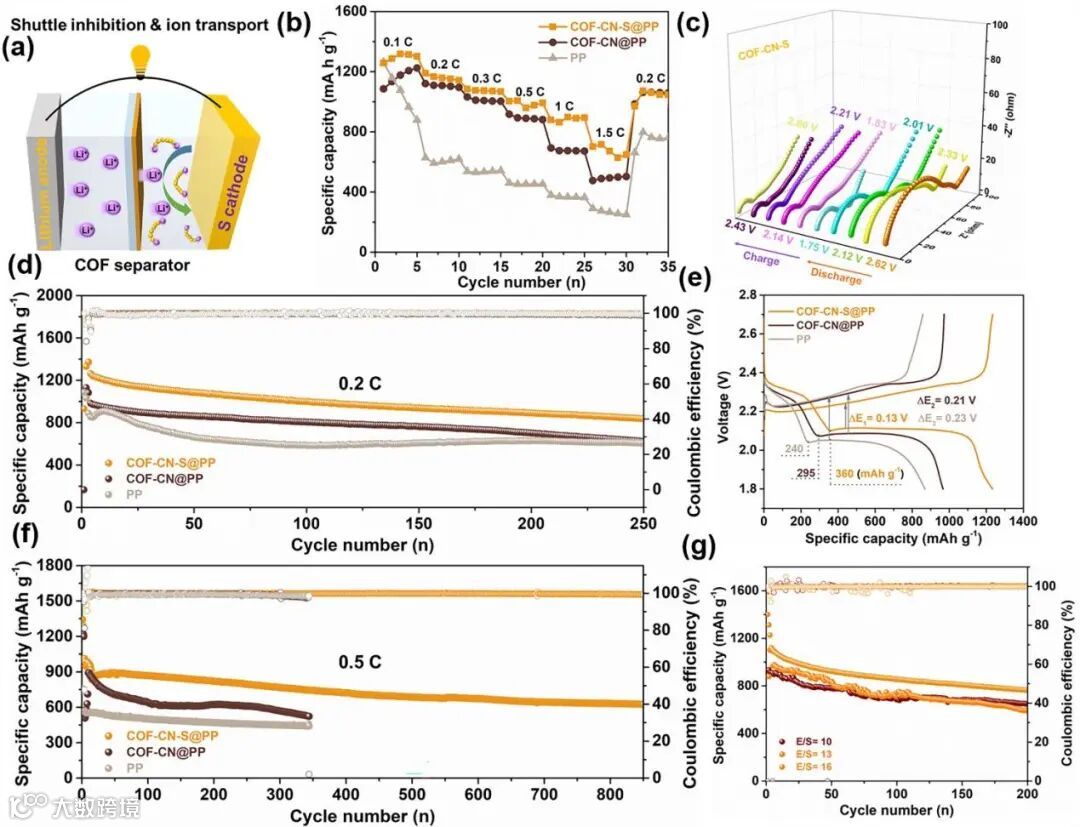 Figure 6. a) Schematic diagram of the Li−S battery with COF separators allowing the fast Li+ transport and blocking polysulfide. b) Rate capabilities. c) ex-situ EIS spectra of the COF-CN-S modified battery at different depths of charge and discharge. d) The long-term cycling performances of Li-S batteries at 0.2 C. e) The charge-discharge voltage profile at the current of 0.2 C. f) The long-term cycling performances of Li-S batteries at 0.5 C. g) Cycle performance for COF-CN-S-equipped batteries of different electrolyte amounts at 0.2 C.