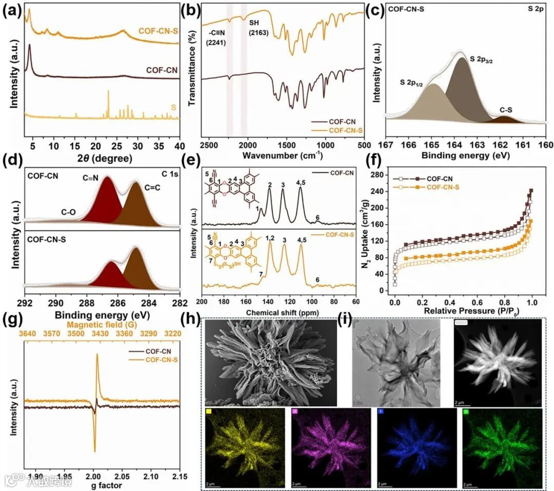 Figure 2. a) X-ray diffraction (XRD) patterns. b) FTIR spectra. High-resolution XPS spectra of S 2p c) and C 1s d). e) solid-state 13C NMR spectrum of COF-CN and COF-CN-S. f) Nitrogen adsorption–desorption isotherms of COF-CN and COF-CN-S. g) EPR spectra of COF-CN-S and COF-CN. h) SEM images of COF-CN-S. i) TEM image, High-angle annular dark-field scanning transmission electron microscopy (HAADF-STEM) and energy-dispersive X-ray spectroscopy (EDS) analysis mapping of COF-CN-S.