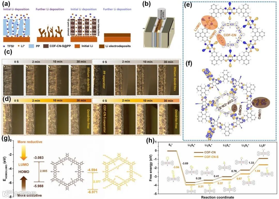 Figure 5. a) Schematic illustration of cycled Li behaviors with PP and COF-CN-S@PP separator. b-d) In situ optical microscopy observations of Li|PP|Li and Li|COF-CN-S@PP|Li batteries during the Li plating/stripping process at 1 mA cm−2 with 0.5 mAh cm−2. e-g) LUMO and HOMO of COF-CN and COF-CN-S. h) Energy profiles for the discharging process from S8 to Li2S on COF-CN and COF-CN-S substrates (insets: the optimized adsorption structures of intermediates).