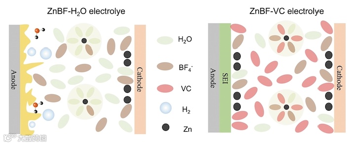 图1. Zn在ZnBF-H2O和ZnBF-VC中的沉积过程示意图。