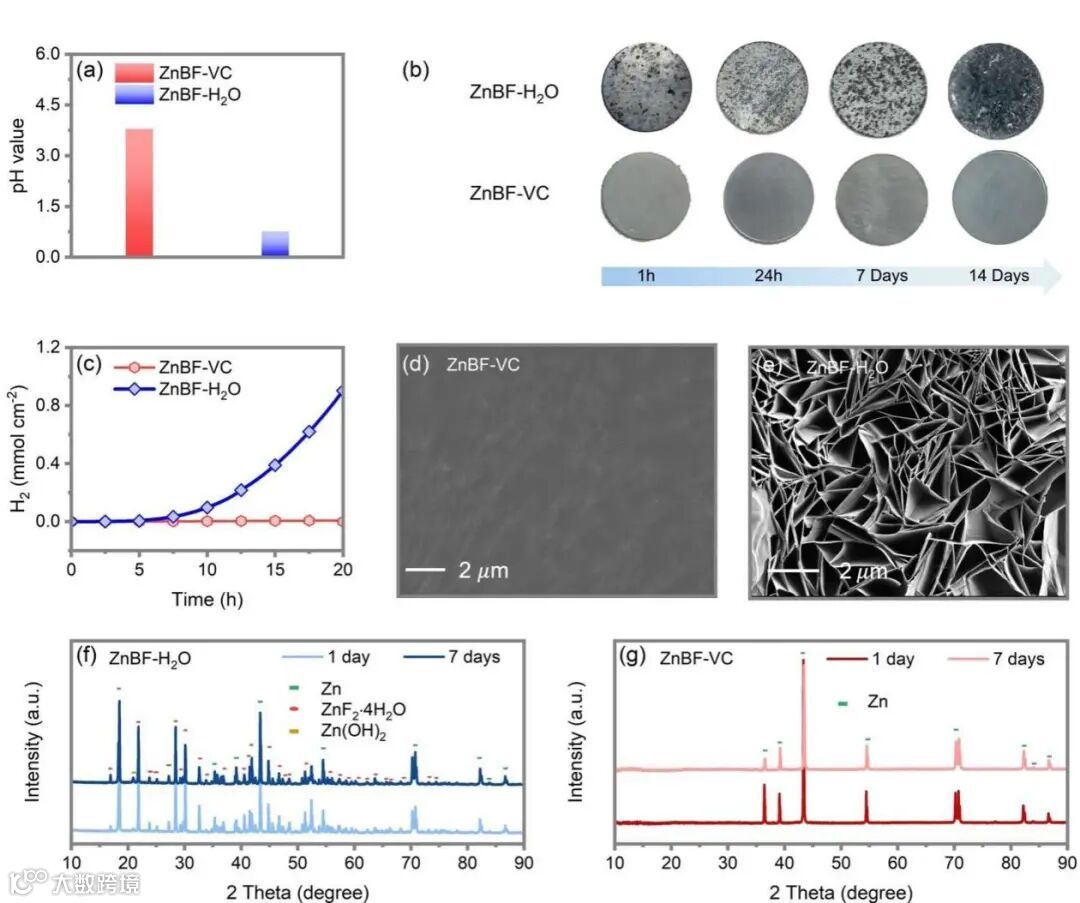 图2 (a) ZnBF-H2O和ZnBF-VC的pH值。(b)锌浸泡在ZnBF-H2O和ZnBF-VC中的照片。(c)气相色谱-质谱(GC-MS)分析Zn金属浸泡在ZnBF-H2O和ZnBF-VC 20小时后的析氢量。(d, e) Zn在ZnBF-VC中浸泡1天的SEM图像(d)和Zn在ZnBF-H2O中浸泡1天的SEM图像(e)。(f, g) Zn在ZnBF-H2O (f)和ZnBF- VC (g)中浸泡后的XRD图谱。