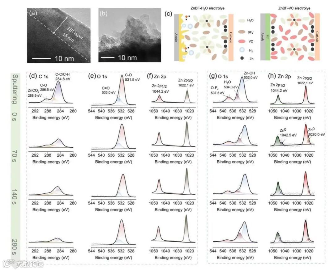 图5 (a, b)在(a) ZnBF-VC和(b) ZnBF-H2O中形成的SEI的TEM图像。(c) Zn在ZnBF-H2O和ZnBF-VC中的沉积过程示意图。(d-f) ZnBF-VC中循环Zn负极在Ar+溅射0s、70 s、140 s和280s后的C1s、O1s和Zn2p的高分辨XPS光谱,(g-h) ZnBF-H2O中循环Zn负极在Ar+溅射0s、70 s、140 s和280s后的O1s和Zn2p 的高分辨XPS光谱。