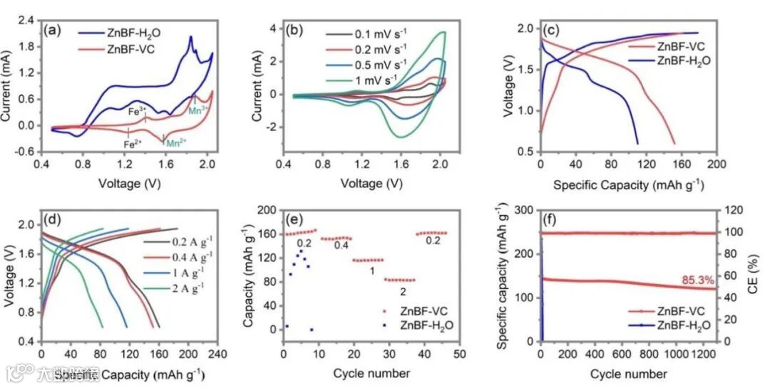 图6 (a) ZnBF-VC和ZnBF-H2O在0.1 mV s-1下Zn||MnHCF全电池的CV曲线。(b) Zn||MnHCF全电池在0.1 ~ 1 mV s-1扫速下的CV曲线。(c) 0.4 A g-1下,ZnBF-VC和ZnBF-H2O中Zn||MnHCF全电池的充放电曲线。(d)在 0.2、 0.4、 1和2 A g-1,Zn||MnHCF全电池在ZnBF-VC中的充放电曲线。(e) Zn||MnHCF全电池在ZnBF-VC中的速率性能。(f) 0.4 A g-1下,Zn||MnHCF全电池在ZnBF-VC中的长循环。