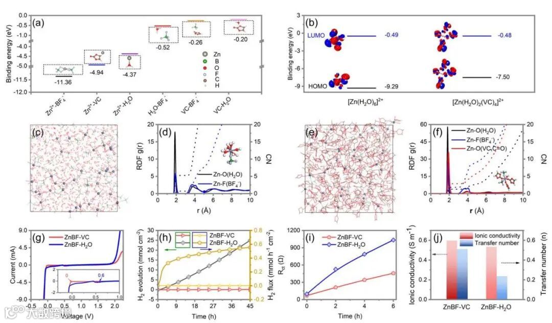 图3 (a)用密度泛函理论(DFT)计算Zn2+、BF4-、H2O与VC的结合能Eb。(b) [Zn(H2O)6]2+和[Zn(H2O)2(VC)4]2+的HOMO和LUMO能级。插图显示HOMO和LUMO等面(等值:0.02 a.u.)。(c, d) ZnBF-H2O和(e, f) ZnBF-VC的MD模拟快照和相应的RDF图。图(d)和(f)中的插图是相应的代表性溶剂化结构。(g) ZnBF-VC和ZnBF-H2O的电化学稳定窗口。(h)原位气相色谱-质谱(GC-MS)分析Zn金属浸在ZnBF-H2O和ZnBF-VC中的析氢反应。(i) ZnBF-VC和ZnBF-H2O中Zn||Zn对称电池在静置不同时间后的电荷转移电阻(Rct)变化。(j) ZnBF-VC和ZnBF-H2O的离子电导率和Zn离子转移数(n)。