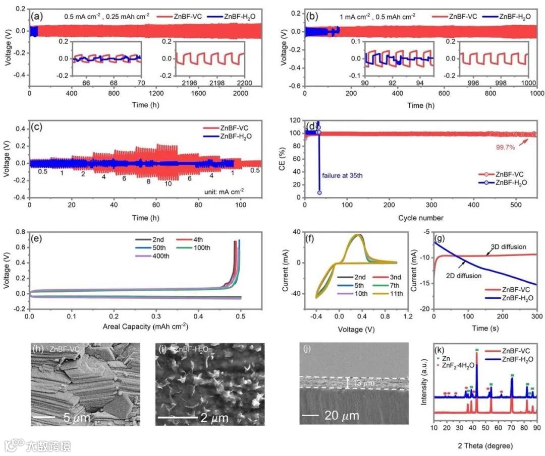 图4 在ZnBF-VC和ZnBF-H2O电解液中的Zn||Zn对称电池在(a) 0.5 mA cm−2,0.25 mAh cm−2,(b) 1 mA cm−2, 0.5 mAh cm−2条件下长循环性能(c)采用ZnBF-VC和ZnBF-H2O电解质制备的Zn||Zn对称电池的倍率性能。(d) Zn||Cu非对称电池在ZnBF-VC和ZnBF-H2O电解液在1 mA cm−2、容量为0.5 mAh cm−2条件下沉积/剥离库仑效率。(e) ZnBF-VC电解液中Zn||Cu电池在第2、4、50、100、400次循环时的电压曲线图。(f)Zn||Ti电池在ZnBF-VC和ZnBF-H2O电解液中的循环伏安曲线。(g) ZnBF-VC和ZnBF-H2O在- 150 mV过电位下的计时电流(CA)测试。(h) ZnBF-VC循环20次后Zn金属的SEM图像。(i)在ZnBF-H2O中循环20次后的Zn金属SEM图像。(j) ZnBF-VC循环20次后Zn金属的SEM横截面图。(k) ZnBF-VC和ZnBF-H2O循环100次后Zn金属的XRD图谱。