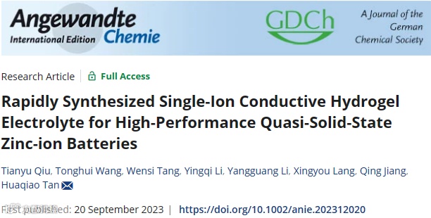 近日,来自东北师范大学的李英奇副教授、谭华桥教授与吉林大学的王同辉教授、郎兴友教授合作,在国际知名期刊Angewandte Chemie上发表题为“Rapidly Synthesized Single-Ion Conductive Hydrogel Electrolyte for High-Performance Quasi-Solid-State Zinc-ion Batteries”的研究文章。该研究文章设计并合成了一类高质量的准固体单Zn2+导体,将PGE与SIC相结合,使两者优势相辅相成。