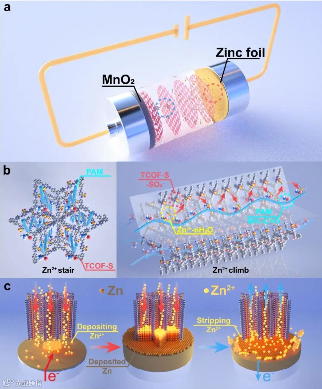 图1. 准固态电解质设计理念 (a)基于TCOF-S-Gel准固态电解质的Zn-MnO2全电池运行透视图。本研究的凝胶电解质设计:(b)俯视图和剖面图显示-SO3-和PAM在COF孔通道中为Zn2+离子的快速迁移提供了“阶梯”;(c) Zn2+离子在COF的引导下均匀可逆沉积/剥离,几乎不产生枝晶。