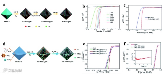 MoC因具有良好的稳定性与导电性而广泛应用于能量转换与存储。然而传统的高温制备往往避免不了离子聚集,间接的制约了催化剂的活性。最近的研究中,在Mo-MOF的基础上进行高温制备,MOF的存在,限制了MoC的大范围迁移形成了3D MoC,大幅度增加了催化剂的原子利用率,催化剂地活性位点也进一步增加。也有相应地研究中加入了微量的贵金属Pt,同样贵金属也均匀分布在催化剂中,对催化剂地性能表现具有相当大地加持作用,催化剂表现出了优异的析氢催化性能。