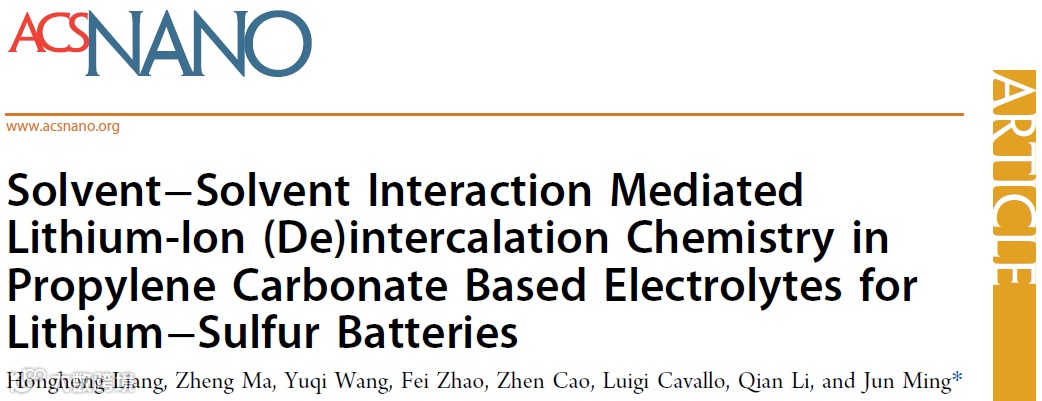 H. Liang, Z. Ma, Y. Wang, F. Zhao, Z. Cao, L. Cavallo, Q. Li, J. Ming*, Solvent-Solvent Interaction Mediated Lithium-Ion (De-)Intercalation Chemistry in Propylene Carbonate-based Electrolytes for Lithium-Sulfur Batteries, ACS Nano, 2023, https://doi.org/10.1021/acsnano.3c04790