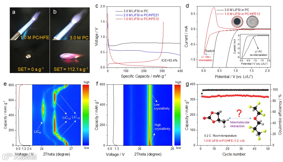 具体而言,作者在PC基电解液中,引入HFE氟醚溶剂作为稀释剂及阻燃剂,设计了1.0 M LiFSI in PC/HFE的阻燃电解液。研究发现,当HFE/PC的体积比达到2/1时,PC基电解液变得与石墨电极相容,Li+可逆脱嵌石墨,呈现经典的充放电曲线,初始库仑效率(ICE)高达93.4%。相比之下,在没有HFE的电解液中,即使PC基电解液的LiFSI浓度达到3.0 M,仍然会发生Li+-PC共嵌、石墨剥落和电解液分解(即放电曲线保持在 0.8 V)。通过循环伏安测试,原位XRD以及电池的循环性能测试进一步证实了加入HFE后电解液与石墨有较好的兼容性(图3)。进一步地,作者也通过“交换实验”发现SEI膜对稳定石墨电极、抑制Li+-PC共嵌的能力不足,进而证明电解液兼容性改善的主要原因可能是电解液微观结构的改变。因此,HFE如何影响 Li+溶剂化结构以及如何进一步影响石墨电极性能值得在分子尺度上进一步探索。