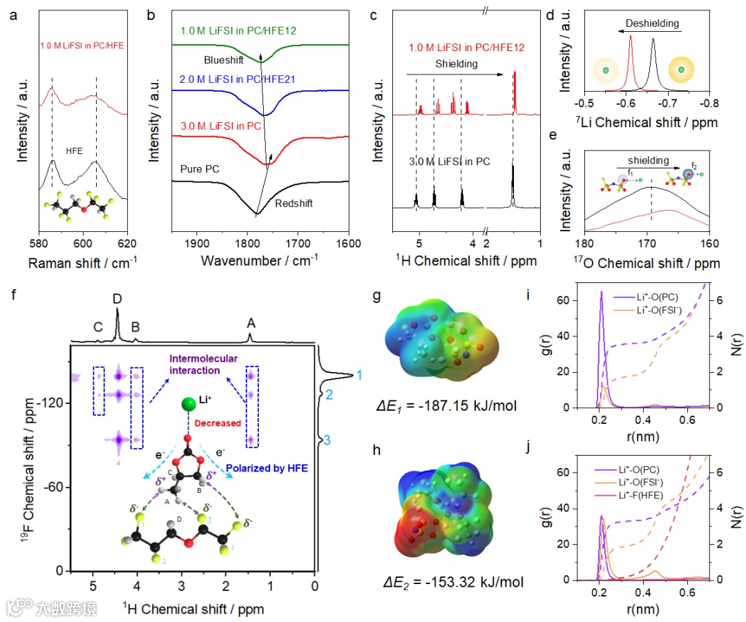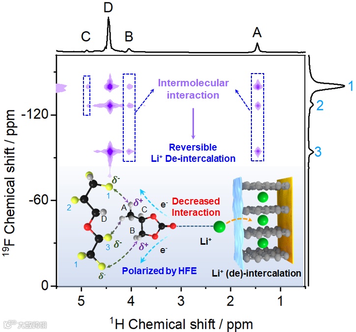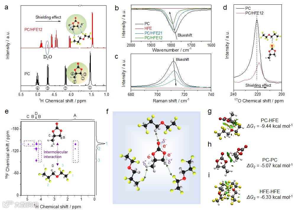 作者通过PC/HFE混合溶剂的解析结果表明(图4),HFE和PC溶剂可以通过富电子的F (δF-)和缺电子的H (δH+)相互作用,造成PC 分子中所有的氢在1H-NMR 谱中向高场移动,同时改变PC中C=O的振动频率,红外/拉曼光谱发生蓝移。利用2D 1H-19F HOESY进一步验证了溶剂分子中电荷分布不均引起的溶剂-溶剂相互作用。PC和HFE的相互作用在图中矩形框中加以标注,其中PC中不同位置(A、B、C)的H原子与HFE中位置1的F原子之间的相互作用最强,并且相互作用强度按F1 > F2 > F3的顺序递减(即 δ+HA - δ-F1 > δ+HA - δ-F2 > δ+HA - δ-F3、δ+HB - δ-F1 > δ+HB - δ-F2 > δ+HB - δ-F3、δ+HC - δ-F1 > δ+HC - δ-F2 > δ +HC-δ-F3)。此外,溶剂间形成共溶剂复合物(例如PC + HFE → PC-HFE)的吉布斯自由能(ΔG)进一步证明了PC和HFE之间相互作用的存在。具体来说,PC-HFE混合物的吉布斯自由能ΔG1为-9.44 kcal mol-1,远低于PC-PC溶剂(即ΔG2 = -5.07 kcal mol-1)和HFE-HFE溶剂(即,ΔG3 = -6.33 kcal mol-1),证明了与同分子相互作用相比,异分子 PC-HFE 相互作用会优先形成。由此可见,电解液溶剂化结构中相互作用的存在是Li+溶剂化结构中的一个重要发现及考量,有利于进一步理解Li+与溶剂相互作用。
