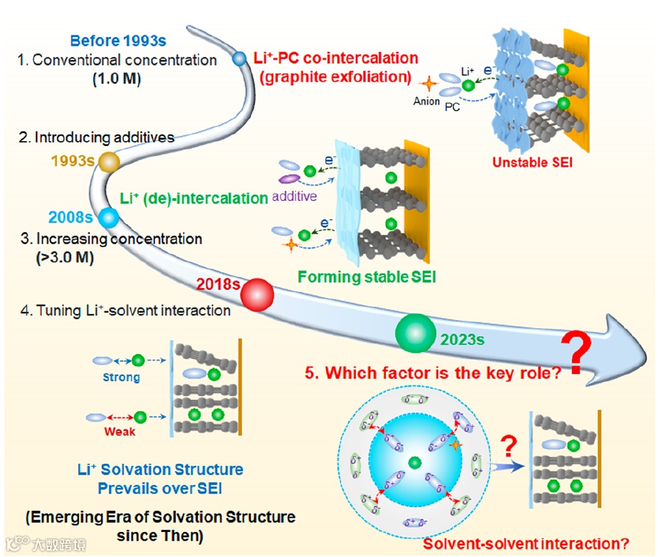 同时期下,与EC基电解液平行的研究中,PC基电解液也一直受到研究者们的关注,其主要原因是PC基电解液在宽温或耐高压等细分应用场景中的表观性能可能会优于EC基电解液,尤其早期的金属锂电池研究中,PC基电解液与金属锂的兼容性更好。但是,碳酸丙烯酯(PC)基电解液与石墨不兼容、存在Li+-PC共嵌石墨而造成石墨剥离的问题一直困扰研究者且阻碍了其应用,其不兼容的原因:也经历了PC难以形成坚固的SEI膜而不能抑制Li+-PC溶剂共嵌、石墨剥离和电解液分解,至Li+-PC相互作用较强需削弱Li+-PC相互作用以实现Li+可逆脱嵌的认知迭代(ACS Energy Lett. 2018, 3, 335-340;ACS Energy Lett. 2019, 4, 2613-2622)。