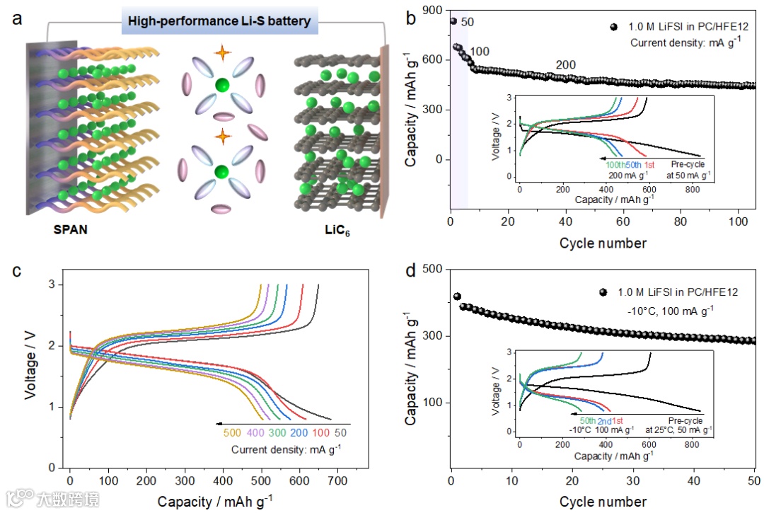 该研究以嵌锂石墨为负极,SPAN为正极,1.0 M LiFSI in PC/HFE为电解液组装了锂离子全电池(图7),进一步证明了PC基电解液与石墨电极的兼容性。在200 mA g-1的电流密度下,Li-S全电池在最初的循环中实现了高达583 mAh g-1的容量,100次循环后放电容量仍可保持在446 mAh g-1,容量保持率为76.5%。此外,在50、100、200、300、400、500 mA g-1的电流密度下分别提供681、617、576、549、523和504 mAh g-1的高容量,表现出较好的倍率性能。此外,作者还研究了锂硫电池的低温特性,在-10°C、电流密度为100 mA g-1的条件下,表现出419 mAh g-1的高容量。研究结果表明,所设计的电解液能够适用于高比能锂硫电池体系的设计,表现出较好的兼容性。