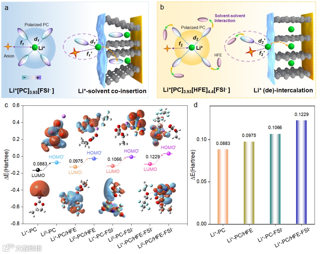 作者研究了新设计电解液的Li+溶剂化结构,以了解电解液与石墨电极的兼容性。首先,作者发现拉曼光谱中HFE稀释剂特征峰的变化在 PC/HFE 电解液中可以忽略不计,表明HFE不会直接参与Li+的溶剂化过程及结构。因此,Li+和HFE之间相互作用可以忽略。简言之,HFE主要位于第二溶剂化层与PC相互作用,削弱Li+和PC的相互作用,促进Li+去溶剂化过程,使得Li+在石墨电极表面相对比较容易地可逆脱嵌(图5)。
