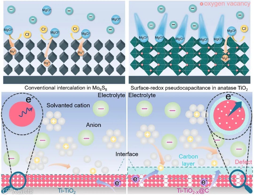 近日,厦门大学赵金保教授团队在国际知名期刊Advanced Energy Materials上发表题为“Surface‐Redox Pseudocapacitance‐Dominated Charge Storage Mechanism Enabled by the Reconstructed Cathode/Electrolyte Interface for High‐Rate Magnesium Batteries”的研究文章。该文章通过超薄碳涂层与氧空位相结合的策略重新构建了锐钛矿TiO2的正极/电解液界面。界面重构后使锐钛矿TiO2绕开了缓慢的Mg2+固相迁移,实现了MgCl+的快速表面氧化还原赝电容电荷存储机制,最终实现了优异的倍率性能。该文章从理论及实验角度系统地分析了界面重构策略的优势,为开发更有前景的正极材料提供了有价值的见解。