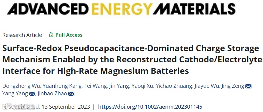 正极/电解液界面重构实现表面氧化还原赝电容主导的高倍率性能镁电池