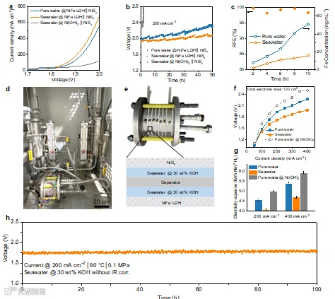 在商业级碱性电解槽中,本文进行了碱性海水电解的实验。与目前市面上使用碱性纯净/淡水的商业级碱性电解槽相比,以海水为基础,采用NiFe LDH作为阳极的电解槽的能耗明显减少了20.7%,并且在200 mA cm-2的电流密度下稳定运行超过100 h。